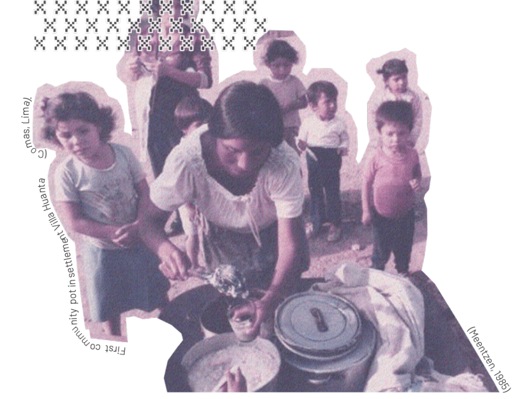 In Peru, comedores populares emerged as a direct response to the mass migrations of the 1950s and 1960s. During this period, thousands of people left the Andean highlands in search of opportunities in Lima, a city unprepared to receive them (Matos Mar, 1984). In here, migrants faced not only the harsh living conditions in the city’s arid outskirts but also discrimination from those who considered them alien bodies to that territory. In this context, traditional Andean practices such as ayni (Quechua for ‘reciprocity’) and minka (Quechua for ‘collectivity’), became essential tools of resilience. These deeply rooted practices allowed communities to organise themselves for the collective benefit, deploying different activities that would give them the tools of an envisioned city and everything that comes with the right of being part of it.